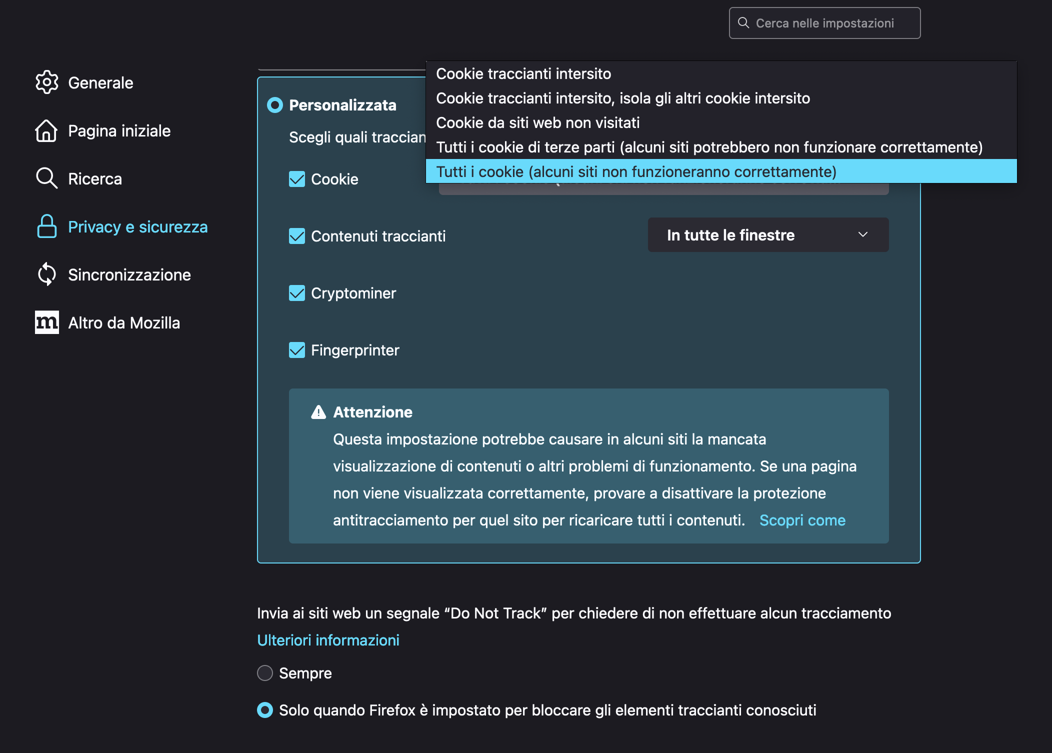 Se è così, dovrai solo cambiare preferenza e scegliere: “Tutti i cookie di terze parti (alcuni siti potrebbero non funzionare correttamente)”.